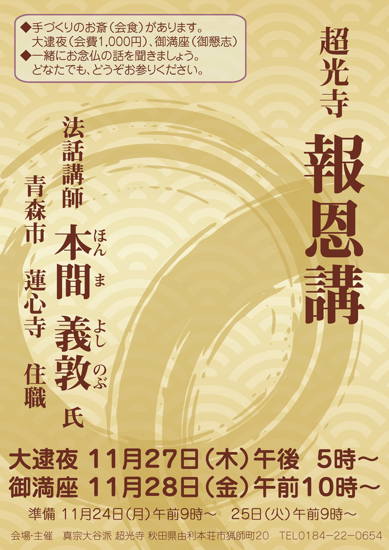 超光寺報恩講大逮夜 2025年11月27日(木)午後5時~御満座 2025年11月28日(金)午前10時~会場 超光寺 秋田県由利本荘市猟師町20講師 本間 義敦(ほんま よしのぶ) 氏 青森市蓮心寺住職 報恩講は親鸞聖人の御命日です。どなたでもどうぞお参りください。